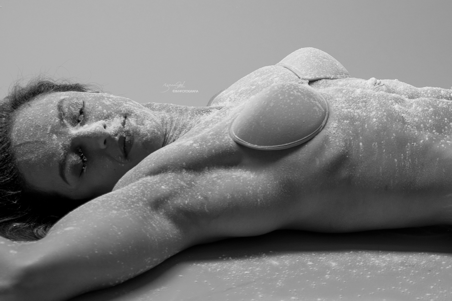 La técnica: mezcla de elementos – harina como símbolo de caos y densidad, combinado con retratos de fuerza física y color vibrante. Ensayo: El polvo cubre, ahoga, ensucia. Pero también recuerda que basta un gesto para sacudirlo y revelar lo que brilla debajo. Frente a la cámara, ella se levantó una y otra vez, con el pulso de quien sabe que la densidad no detiene el fuego interno. La harina voló como tormenta, y aún así, su fuerza permaneció intacta: desafiante, luminosa. Esta serie no habla de fragilidad, sino de la danza entre caos y voluntad, del poder de volver a erguirse más firme que antes.